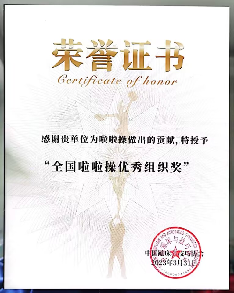 本网讯(通讯员 吴亚婷)由国家体育总局体操运动管理中心主办的第五届中国啦啦操文化纪于3月31日在海南海花岛举办,我校喜获“全国啦啦操优秀组织单位”,体育课部教师郭红莲、吴亚婷参加了本次交流活动,并代表学校领取了该项殊荣。