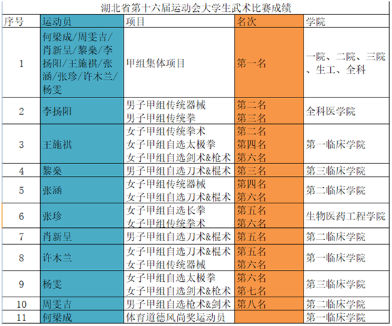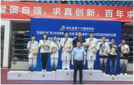本网讯(通讯员 时保平)4月13-15日,由湖北省人民政府主办,省教育厅、省体育局、宜昌市人民政府共同承办的湖北省第十六届运动会青少年体育类(大学生组)暨湖北省第十三届大学生运动会武术比赛在三峡大学圆满落幕。本次比赛共有来自全省43所高校442名运动员参加,我校武术队10名队员在教练员时保平老师的带领下参赛,经过激烈的角逐,斩获1金2银2铜等十余项成绩。