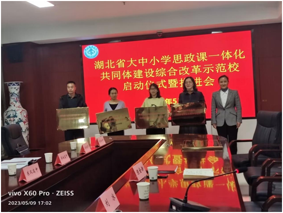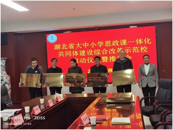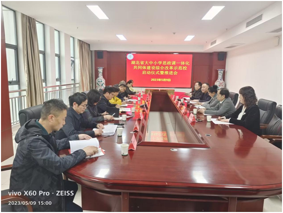 本网讯(通讯员 魏晨 陈全新)5月9日下午,我校举办了湖北省大中小学思政课一体化共同体建设示范校启动仪式暨推进会。校党委常委、统战部长谭艳、马克思主义学院班子成员、教学办、全体思政课教师、10个理事会成员单位负责人及骨干教师等共60多人参加了本次会议。会议由马克思主义学院刘冰院长主持。