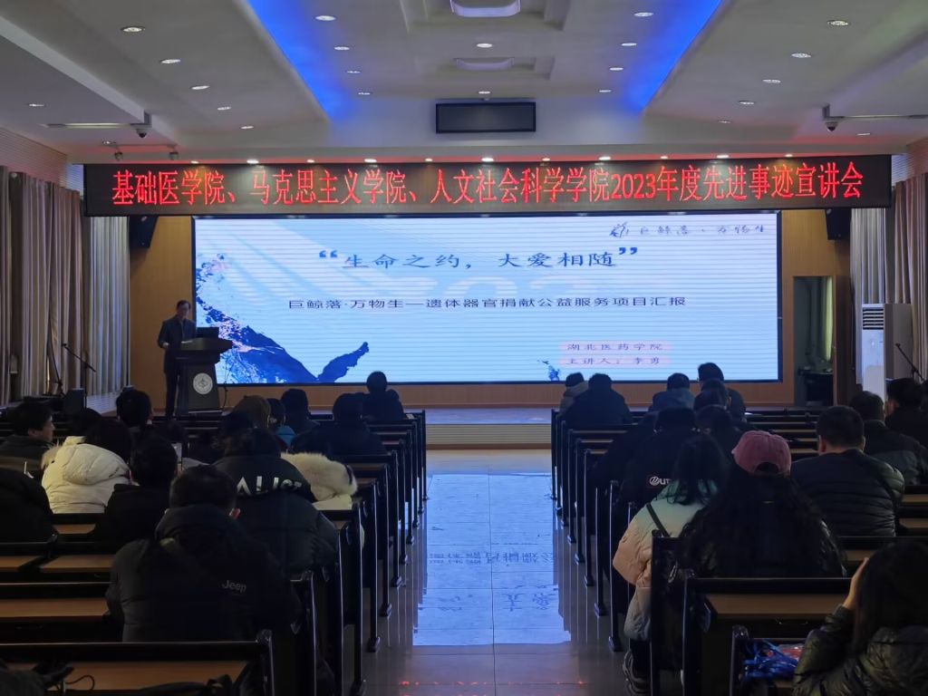 本次宣讲会邀请到2023年“荆楚楷模”、“十堰好人”、基础医学院形态学实验室副主任、巨鲸落·万物生遗体器官捐献志愿服务队队长李勇老师和2023年湖北省一流本科课程《病理生理学》负责人张亚辉老师进行分享交流。