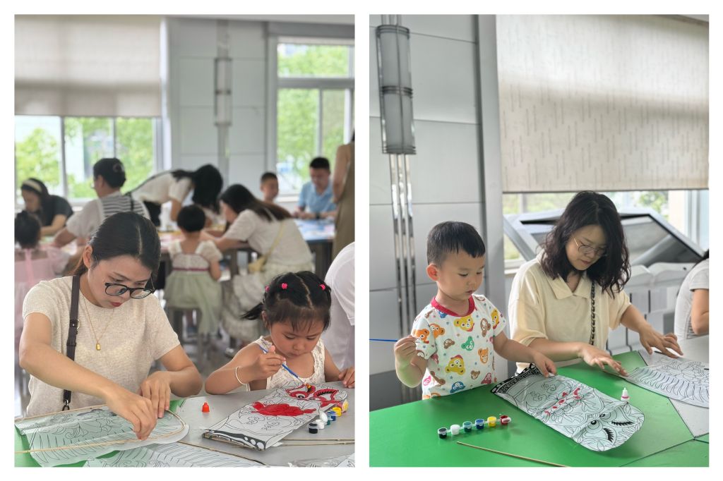活动中,家长和孩子们一起发挥自己的想象力及动手能力亲手组装风筝,用各种颜料,进行天马行空的涂鸦,制作独一无二的风筝,感受风筝成型。