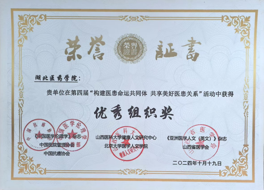 本网讯(通讯员 黄圣胤)2024年10月18-20日,由《中国医学伦理学》杂志、中国医院管理协会等主办,山西医科大学等承办的第四届“构建医患命运共同体,共享美好医患关系”学术会议成功召开。会议共有主旨发言、分论坛交流、现场对谈、颁奖典礼四个环节。本次大会评选出15个特等奖、105个一等奖、130个二等奖、174个三等奖,并向30家单位颁发“优秀组织奖”。我校继去年获“优秀组织奖”后今年再次获此殊荣。