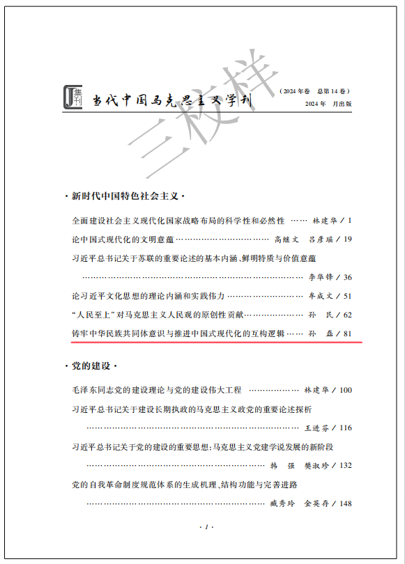本网讯(通讯员 陈玫霖)近日,《当代中国马克思主义学刊》(2024年卷)(总第14卷)由社会科学文献出版社出版。我校马克思主义学院孙磊博士的论文《铸牢中华民族共同体意识与推进中国式现代化的互构逻辑》被该学术集刊全文收录。《当代中国马克思主义学刊》(2024年卷)由新时代中国特色社会主义、党的建设、世界社会主义、思想政治教育四个板块组成,共收录23篇国内知名学者高质量学术文章。《当代中国马克思主义学刊》致力于关注当代中国马克思主义理论建设,直面时代课题,努力构建具有中国特色、中国风格、中国气派的马克思主义理论学科话语体系。该刊物已被集刊全文数据库(www.jikan.com.cn)收录,被国内多所知名高校、科研院所图书馆收藏。