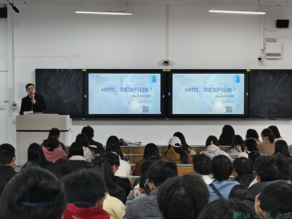 在讲座中,翟成蹊老师深入剖析了AI给社会生活各方面带来的变革,从工作模式的转变,到人际交往方式的更迭,让同学们深切感受到AI的巨大影响力。随后,他结合心理学专业知识,分享了在AI浪潮下,同学们如何保持自身独特价值,以及在学习中如何善用AI技术的方法。同学们全神贯注,纷纷被生动的讲解和深刻的见解所吸引,积极参与互动答题,现场气氛热烈,思维的火花不断碰撞。专业讲座结束后,翟成蹊结合目前就业形势与AI应用,为同学们详解心理学专业就业前景与发展路径,建议大家努力学好专业课,构建“心理学+数据分析”等复合技能体系。