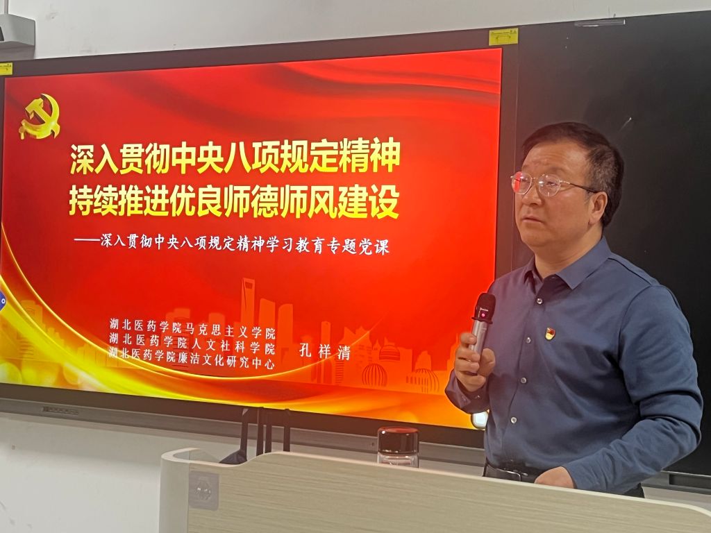 孔祥清以《深入贯彻中央八项规定精神 持续推进优良师德师风建设》为题,为全体党员梳理党的十八大以来历次党内集中教育情况。他带领同志们原汁原味学习中央八项规定精神及实施细则,深刻领悟精神实质与实践要求;密切结合新时代高校教师职业行为准则规定,引导教职工持续推进优良师德师风建设;通过深刻汲取典型案例教训,推动学院学习教育“学、查、改”取得实效。