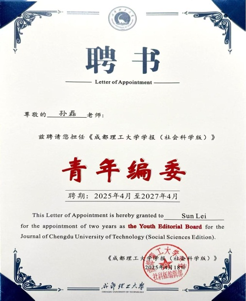 本网讯(通讯员 彭惜芹)近日,马克思主义学院孙磊博士入选《成都理工大学学报(社会科学版)》青年编委。