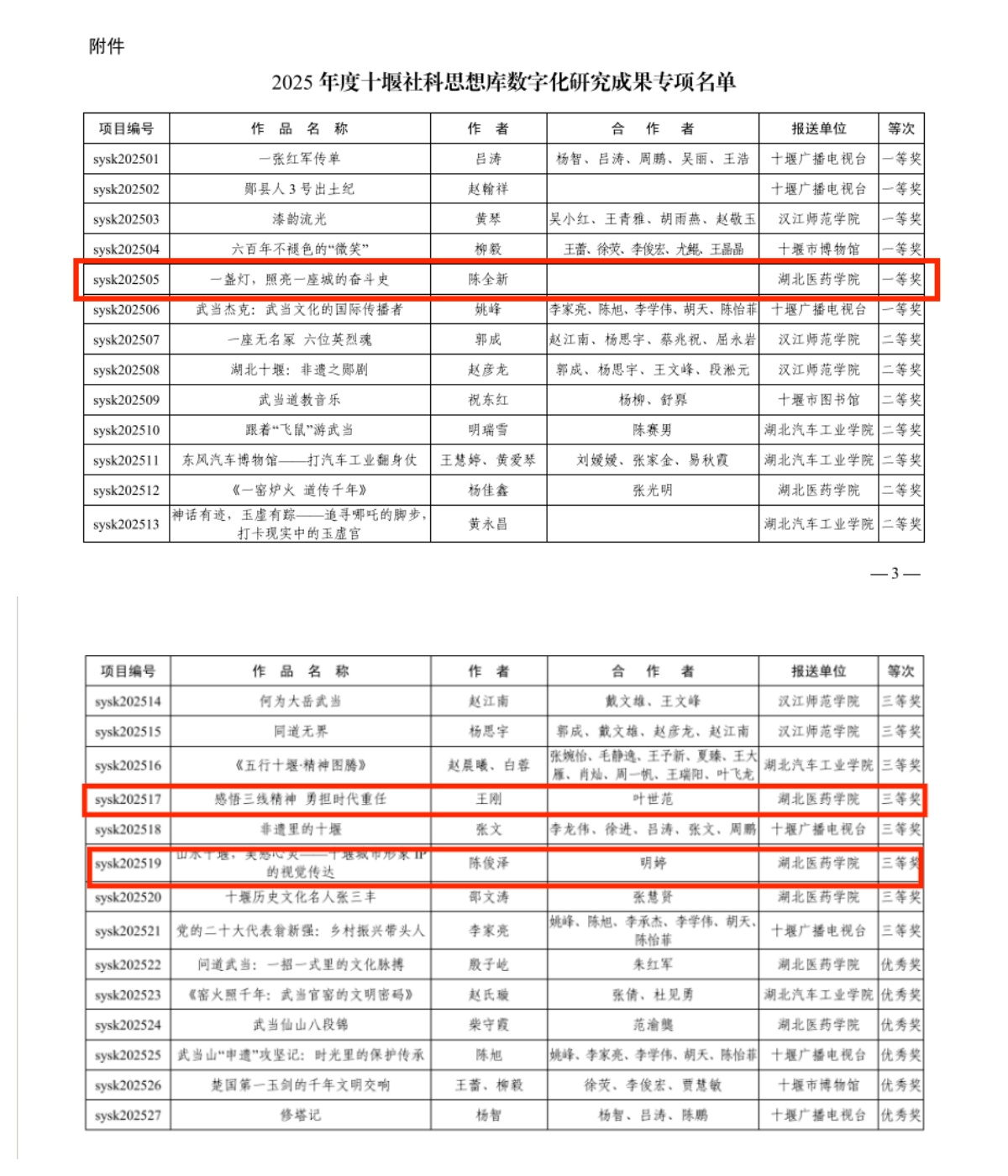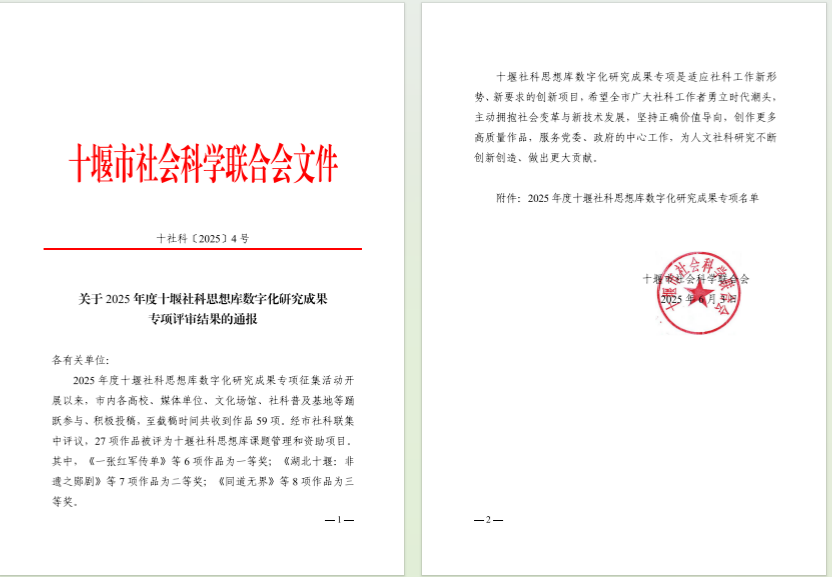本网讯(通讯员  彭惜芹)近日,十堰市社会科学联合会公布2025 年度 “十堰社科思想库数字化研究成果” 获奖名单,马克思主义学院选送的一盏灯,照亮一座城的奋斗史等3 部短视频作品凭借广泛的代表性与创新性成功斩获奖项。