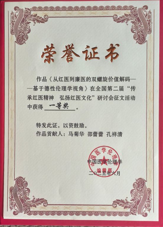 本网讯(通讯员 肖飞)6月28日至29日,由《中国医学伦理学》杂志主办、哈尔滨医科大学承办的第二届全国“传承红医精神 弘扬红医文化”研讨会在哈尔滨医科大学成功召开。本次研讨会聚焦红医精神的深刻内涵与时代价值,旨在推动红医文化资源的整合以及红医育人体系的构建,吸引了众多专家学者与研究生参与。经过三轮论文盲评,我院马菊华、邵蕾蕾、孔祥清三名老师合作的《从红医到廉医的双螺旋价值解码——基于德性伦理学视角》获得一等奖、陈俊泽、马菊华老师的《红医精神的哲学反思:从本体、认知到实践》获得二等奖的好成绩,马菊华老师受邀作主旨报告。
