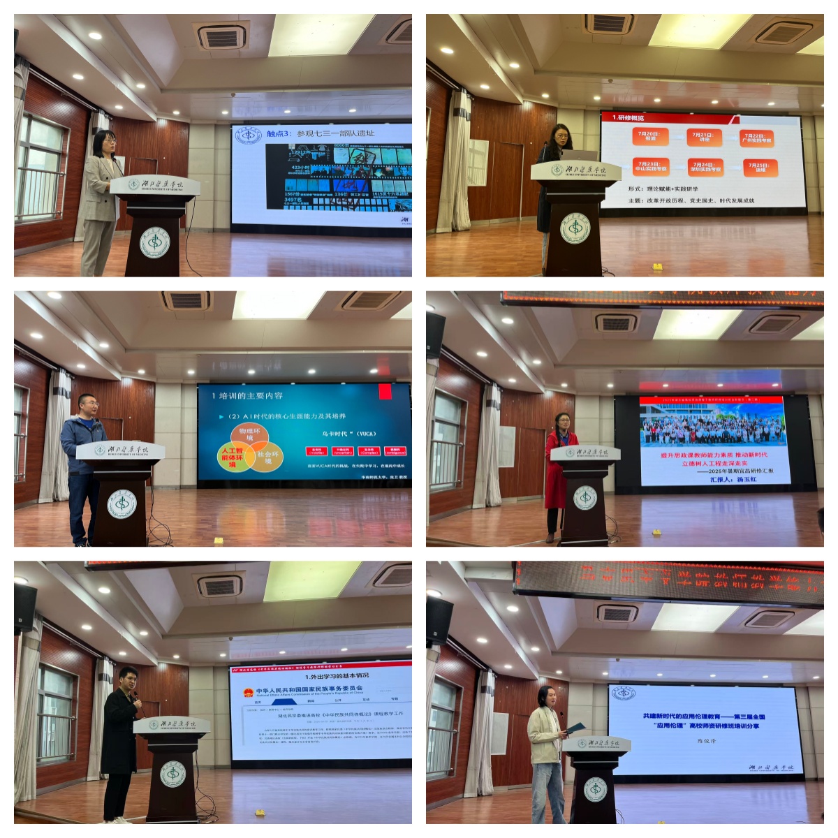 会上,参加暑期外出培训的6位教师依次展开分享,首先马菊华老师通过《中华医学会医学伦理学分会 2025年学术年会暨中青年学术会议巡览》,将医学伦理学与思政教育在价值引领、道德培育方面相结合进行阐述;高志婕老师,以《感悟改革开放伟力,赋能思政课程建设—2025年暑期实践研修汇报》为题,与我们交流她的研修心得;柴晓运老师结合当下人工智能正深刻改变教育生态,围绕如何借助 AI 赋能教与学,给现场教师带来深刻思考;提升教师能力是推动立德树人落地见效的关键,汤玉红老师分享了《提升思政课教师能力素质推动新时代 立德树人工程走深走实2025年暑期宜昌研修汇报》;《中华民族共同体概论》是铸牢中华民族共同体意识的重要课程,李成隆老师随后为现场教师带来暑期这门课程培训的学习经验;最后,陈俊泽老师从《共建新时代的应用伦理教育—第三届全国“应用伦理”高校师资研修班培训分享》,将应用伦理与社会现实紧密相连,对思政课增强针对性和实效性具有重要意义。