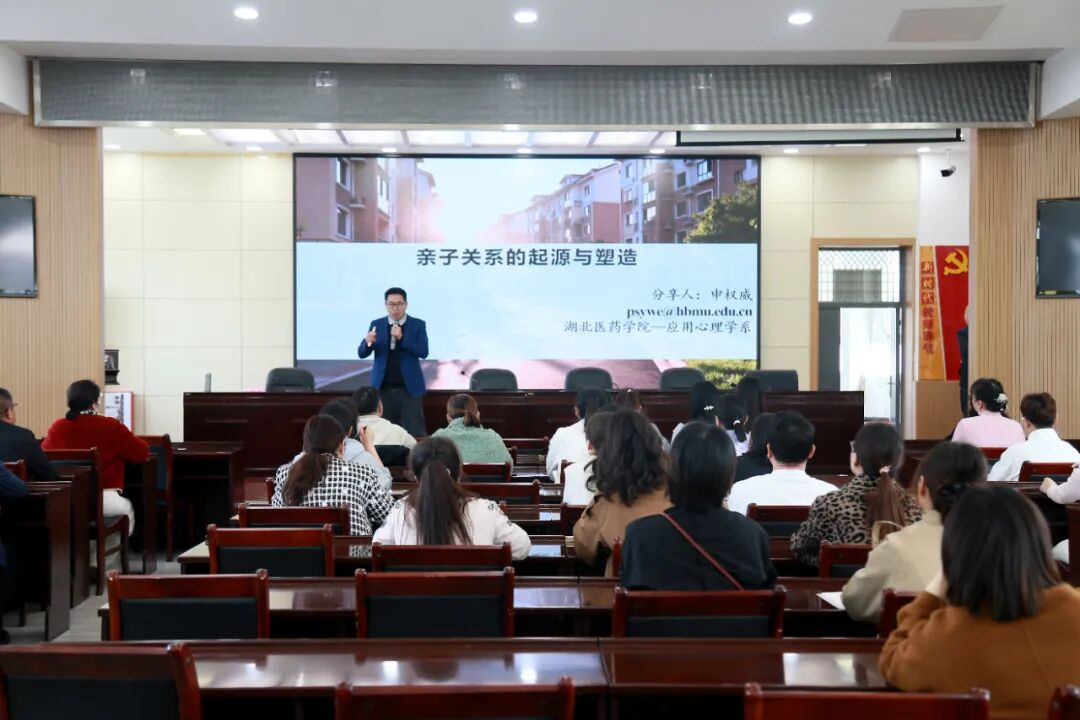 本网讯(通讯员 申权威 李嘉润)为进一步推动大中小学心理健康教育一体化建设,提升家庭教育水平,助力家长科学构建良好亲子关系,2026年3月31日下午,湖北医药学院马克思主义学院应用心理学系副教授、心理学博士申权威受邀为十堰市实验中学家长课堂作专题授课。本次活动围绕“亲子关系的起源与塑造”这一主题展开,实验中学党委副书记邵传国及与会家长共同参与。