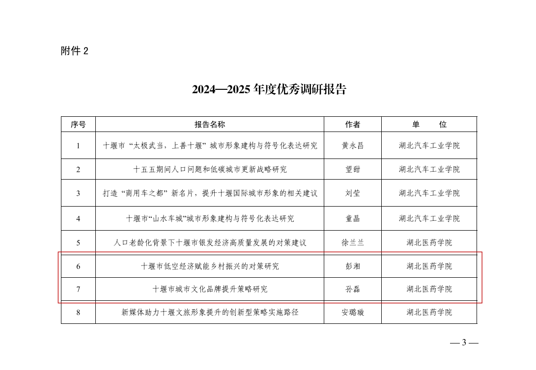 本网讯(通讯员 彭惜芹)近日,十堰市社会科学联合会发布通报,我院3项成果获评2024-2025年度优秀社科成果。其中,彭湘老师《十堰市低空经济赋能乡村振兴的对策研究》、孙磊老师《十堰市城市文化品牌提升策略研究》获评优秀调研报告,陈全新老师的短视频作品《一盏灯,照亮一座城的奋斗史》获评优秀社科普及作品。